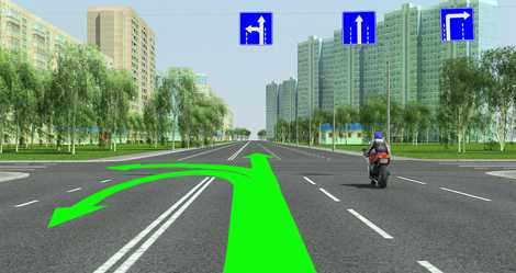 Для поворота направо нужно выбрать полосу, над которой установлен знак, разрешающий поворот направо. Для поворота налево или разворота — знак, разрешающий поворот налево.