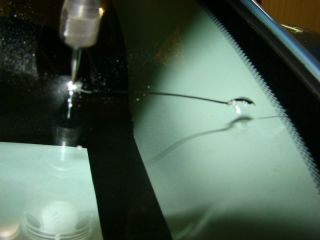 До восстановления поврежденной поверхности дефект лобового стекла в виде лучеобразных трещин требует дополнительной обработки при помощи дрели. Радиальные трещины должны быть рассверлены для обеспечения надежной прокладки полимера. Выбор глубины сверления зависит от каждого конкретного случая, но, как правило, не рекомендуется сверлить глубже середины верхнего слоя. Важно, чтобы глубина сверления не превышала толщину верхнего слоя стекла, в противном случае вы повредите промежуточный пластиковый слой, что приведет к разрушению многослойной структуры лобового стекла.