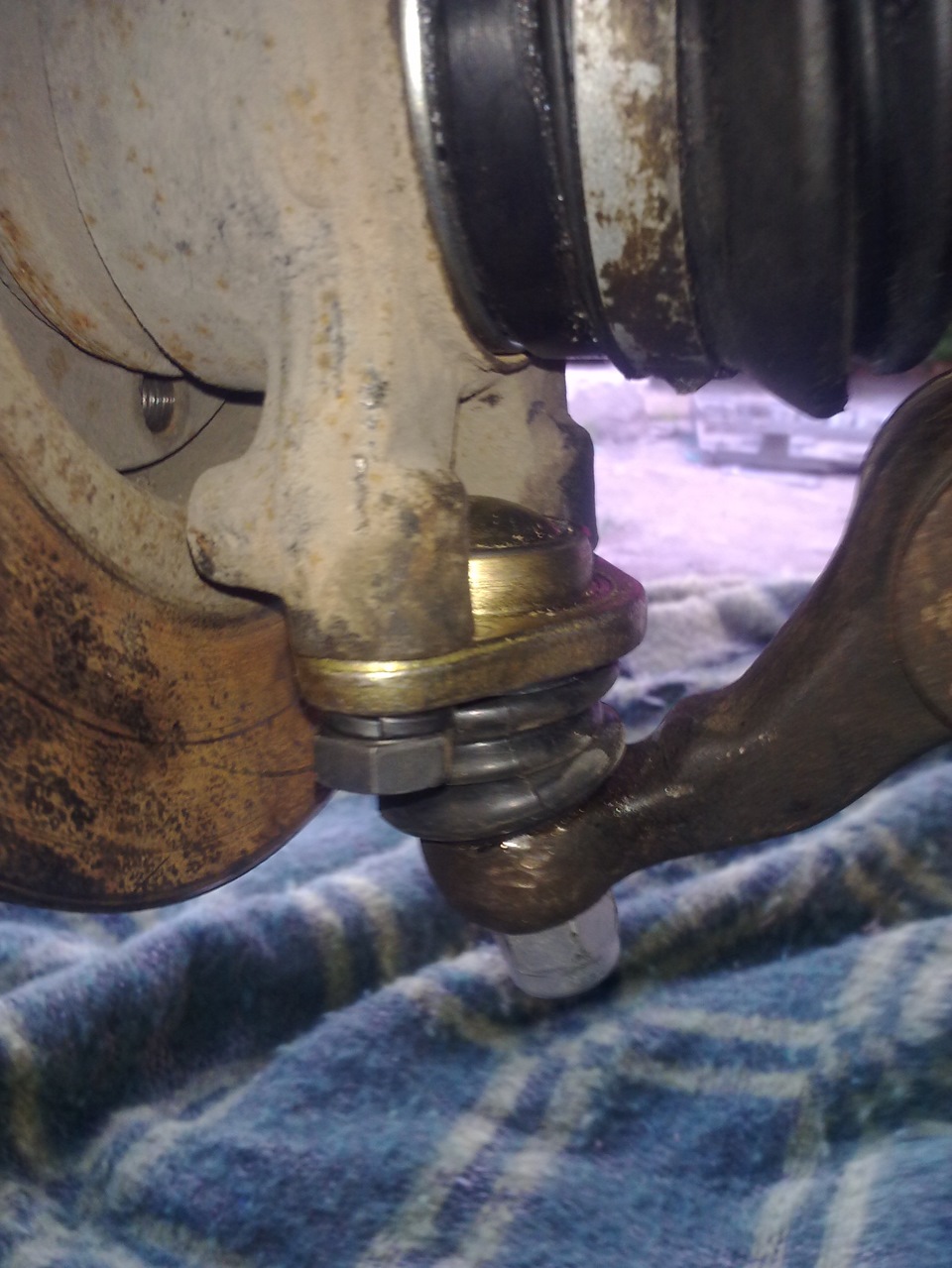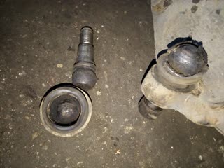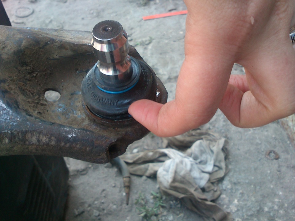 - Снимите верхнюю и нижнюю аксессуары и снимите старый шаровой шарнир. Если пресс выходит чисто, просто дважды проверьте, нет ли на поворотном кулаке краев и скрытых повреждений.