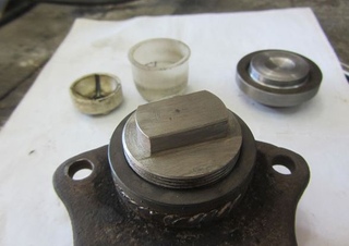 - В донышке высверливается отверстие размером с шар пальца (с небольшим зазором, разумеется). Высверливается — сказано условно. Необходим фрезерный станок. Не бойтесь при расточке повредить пластиковый вкладыш, всё равно вы будете его менять. Внутри нарезается резьба. Это достаточно сложная процедура из-за большого диаметра.