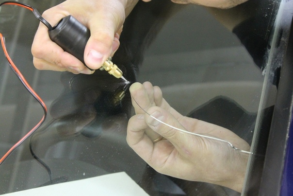 4. Заливка повреждённого места. Для введения полимера можно использовать аппликатор с инжектором и насосом создающим давление, но можно обойтись и без него. Главное при этом – залить так, чтобы не осталось завоздушенных полостей. Для этого вязкость состава подбирается на месте так, чтобы можно было легко заполнять. При этом с внутренней стороны создаётся небольшое механическое воздействие на стекло. Используется также прогрев повреждённого места изнутри. В итоге, возникает капиллярный эффект и состав более эффективно заполняет дефектное место.